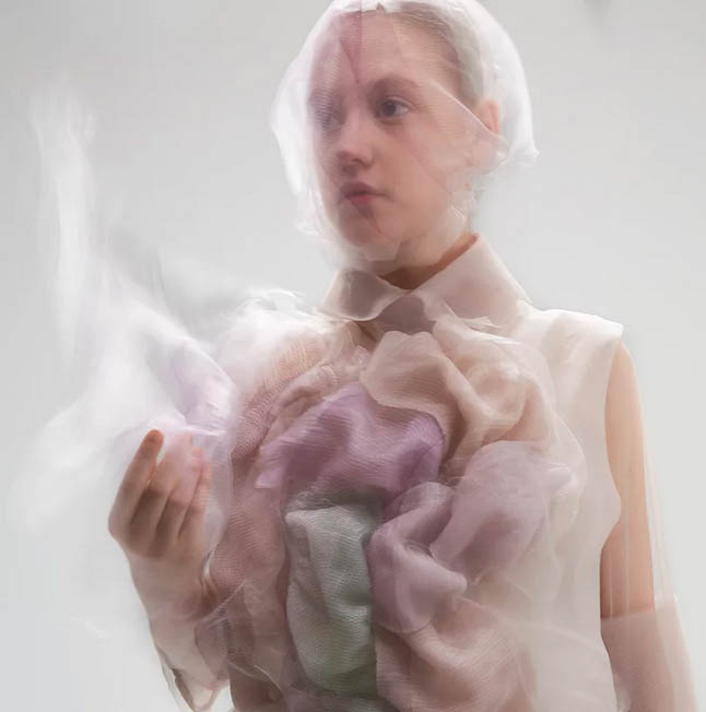 به گزارش گالري آنلاين، اين مجموعه تحت عنوان "آب جاري، زمان ايستاده" ماهيت بصري و ذاتي حرکت و ثبات را به تصوير مي کشد، او نمايش ميدهد که چگونه انرژي هاي مختلفي از طريق پوشاک جريان مي يابد، او رنگ ها را در محيط نزديک همچون آينه مي بيند.