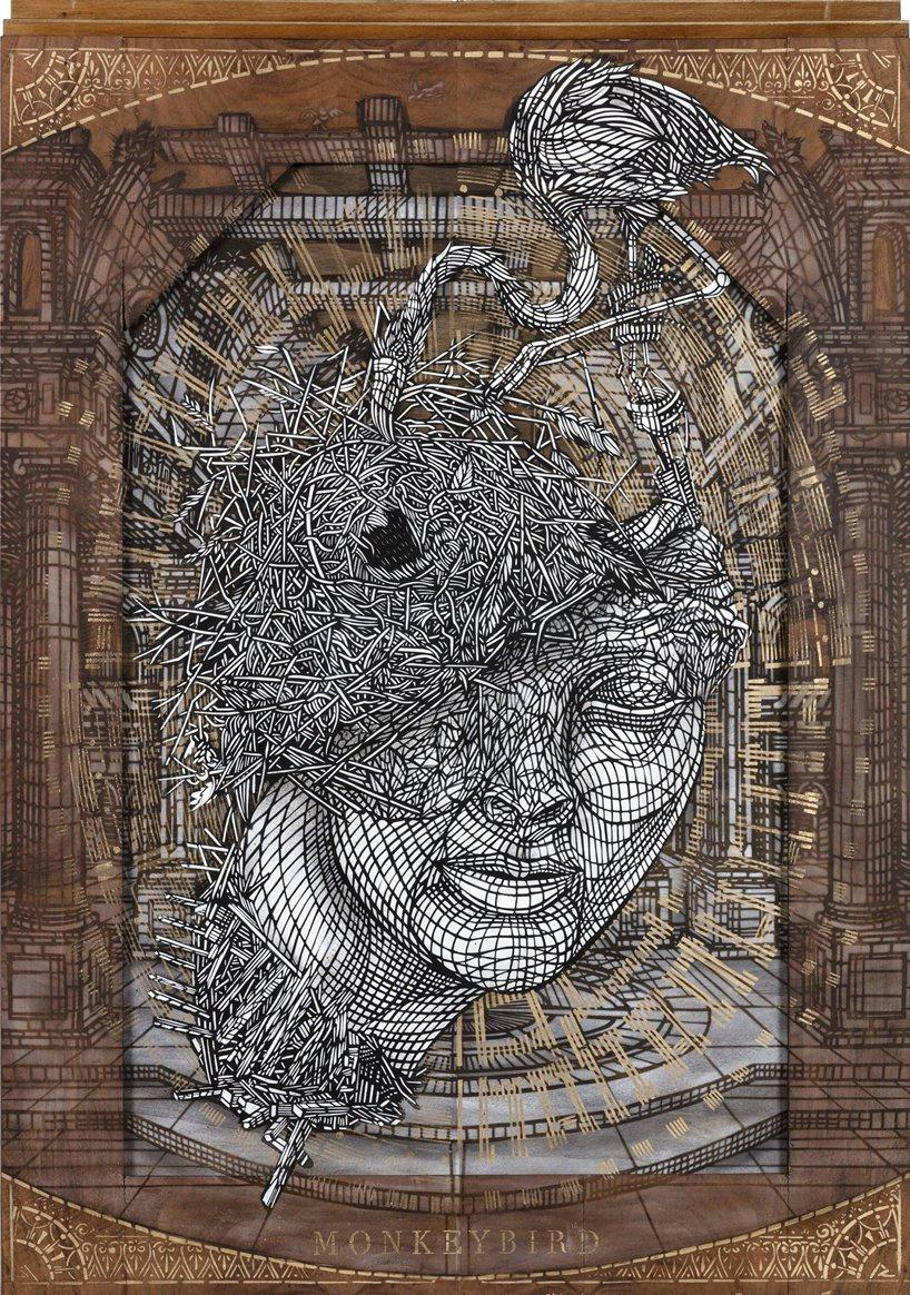 به گزارش گالري آنلاين، monkeybird مأموريت کارهاي خود را انتقال مضامين اجتماعي به ديوارهاي بيروني موزه ها و ساير مؤسسات با خطوط سياه و سفيد و خطوط چهار گوشه اي و نقوش طلايي ميداند.