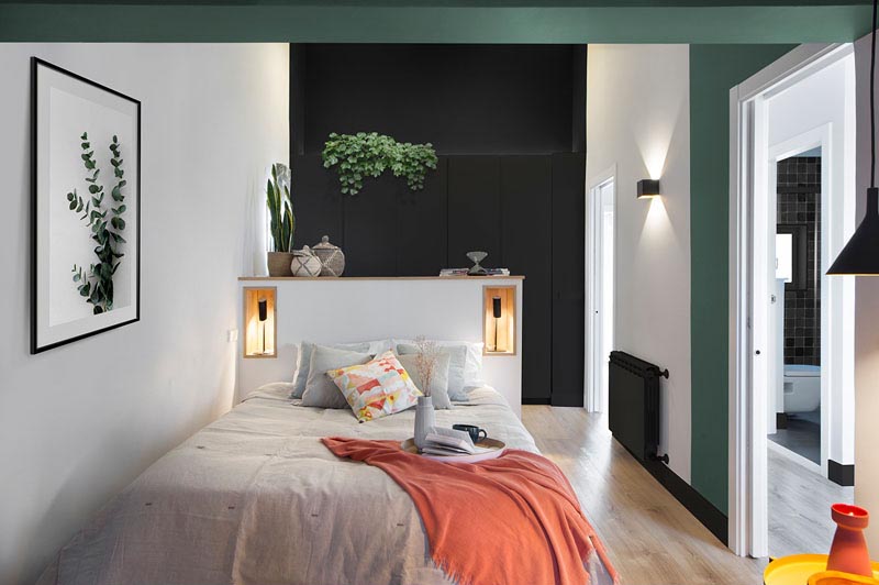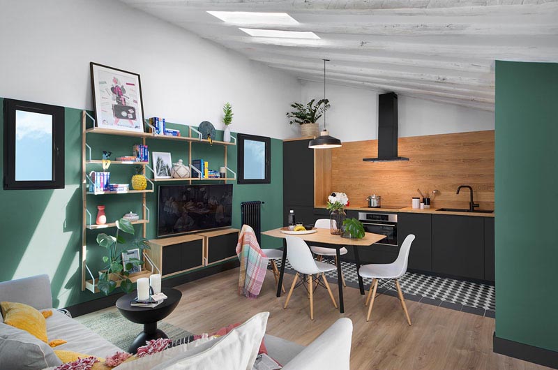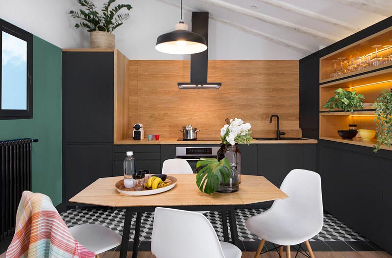 اتاق نشيمن با فضاي ناهار خوري و آشپزخانه تلفيق شده و قفسه ديواري فضاي ذخيره سازي اضافي را در کنار کابينت هاي مشکي مات با تم کلي رنگ هاي سياه و سبز در سراسر اين آپارتمان اسپانيايي ايجاد کرده است.