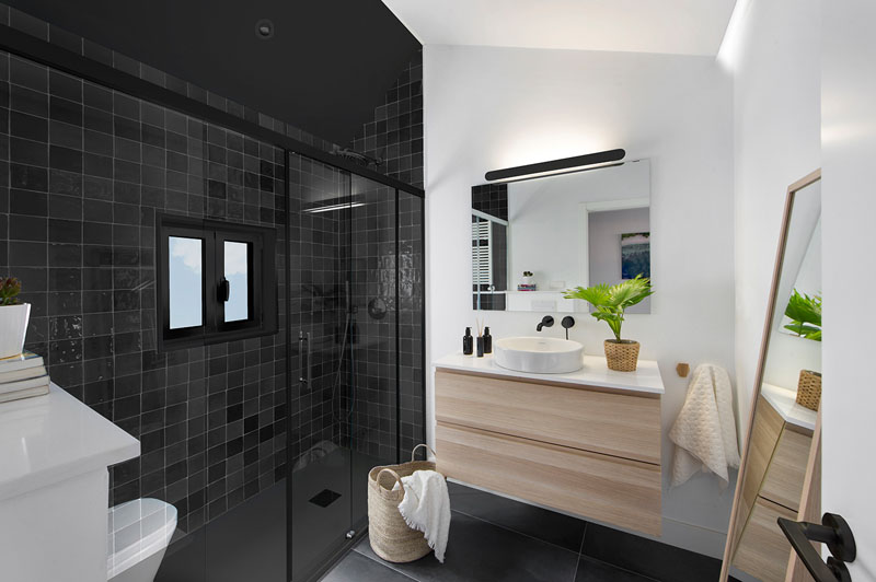 در اين حمام مدرن، کاشي هاي مشکي مربع حوزه حمام و دوش را  با رنگ و از طريق پارتيشن شيشه اي مجزا ساخته ضمن اينکه متريال چوب تمي طبيعي به دکوراسيون مي بخشد.