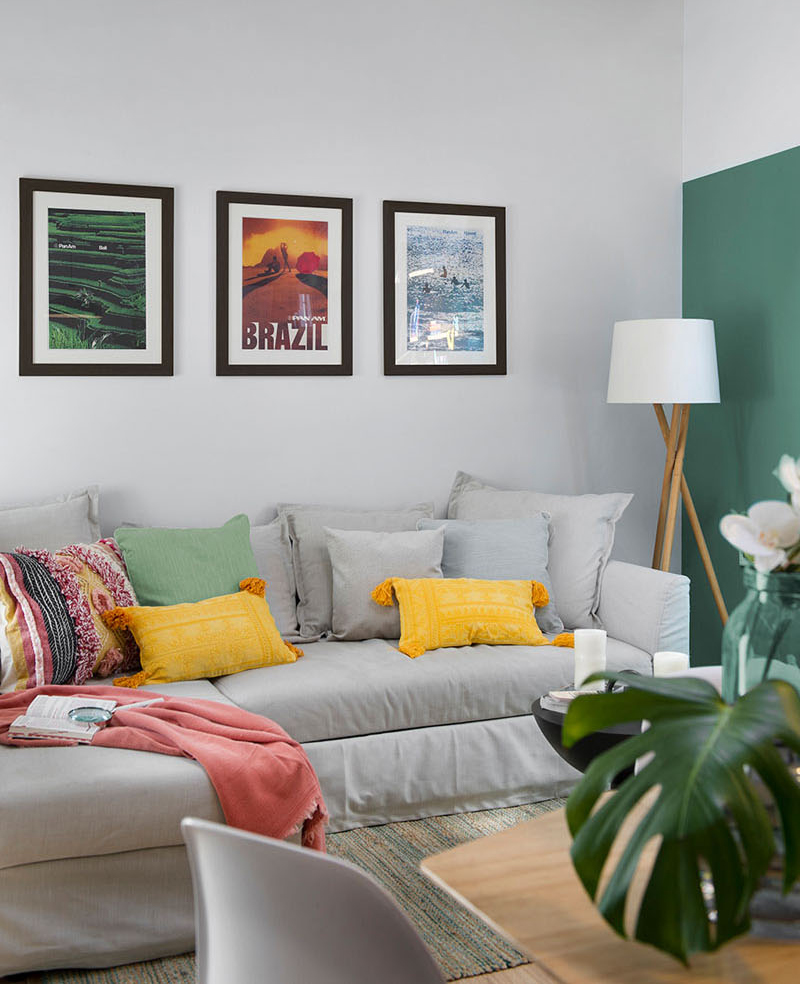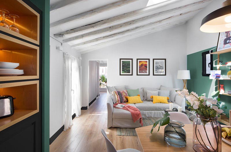 به گزارش گالري آنلاين، در کنار درب ورودي يک تراس کوچک قرار دارد که شامل صندلي ها، مکاني براي غذا خوردن و باربيکيو است. اين آپارتمان با سبک معاصر و داراي اتاق نشيمني با سقف شيب دار است که با مبلمان راحتي ال شکل، تابلوهاي هنري، قفسه دکوري و ديوار سبز رنگ طراحي شده؛ همچنين در کنار نشيمن راهرويي نه چندان طولاني وجود دارد که به ساير قسمت هاي منزل منتهي مي شود.
