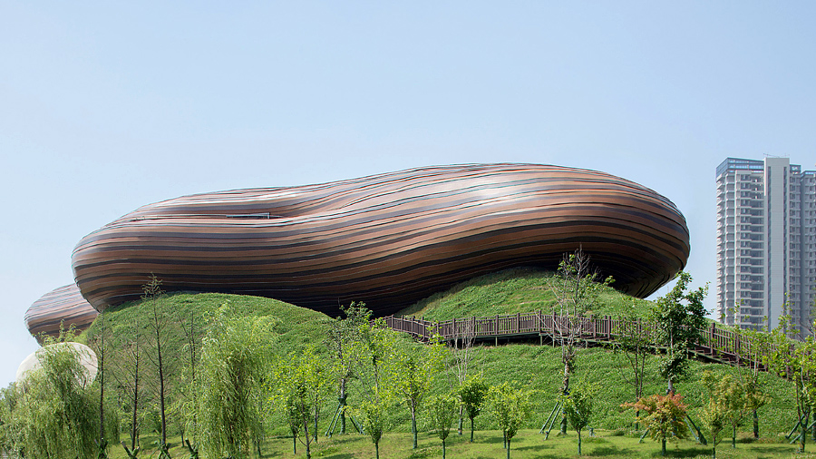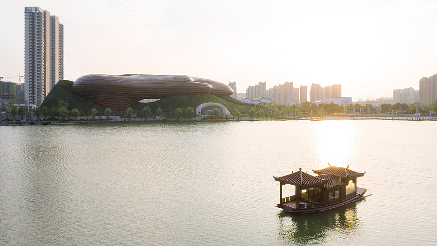 فرم قهوه اي خميده و پوشيده از آلومينيوم موزه ليانگ در چين با معماري CROX به طوري طراحي شده است تا مانند يک ابزار موسيقي سنتي باشد.