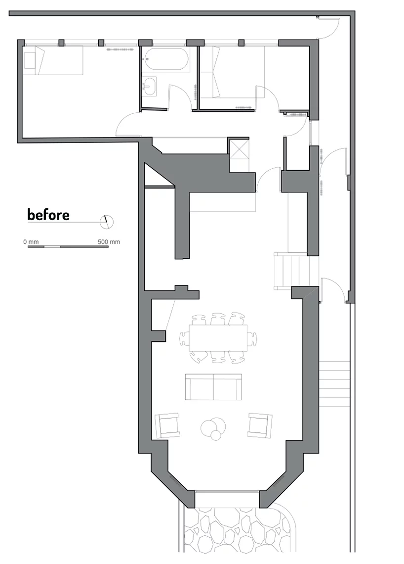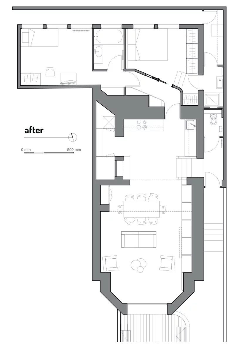 آتليه فضاهاي گردش را کاهش داد تا منطقه بزرگتري را براي ايجاد يک محيط راحت تر براي زندگي فراهم کند. طراحان يک حمام ديگر به خانه اضافه کردند، اتاق خواب اصلي را بزرگ کردند و يک اتاق خواب هندسي سفارشي را در اتاق نشيمن طراحي کردند. يک قطعه داراي درب هاي سفيد است که توسط چهار دايره بزرگ و آب نباتي رنگ از ديوار برش خورده که طاقچه ها، ميز و يک کاناپه دنج را در خود جاي ميدهد.