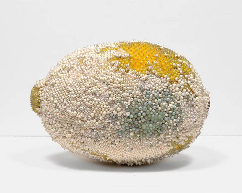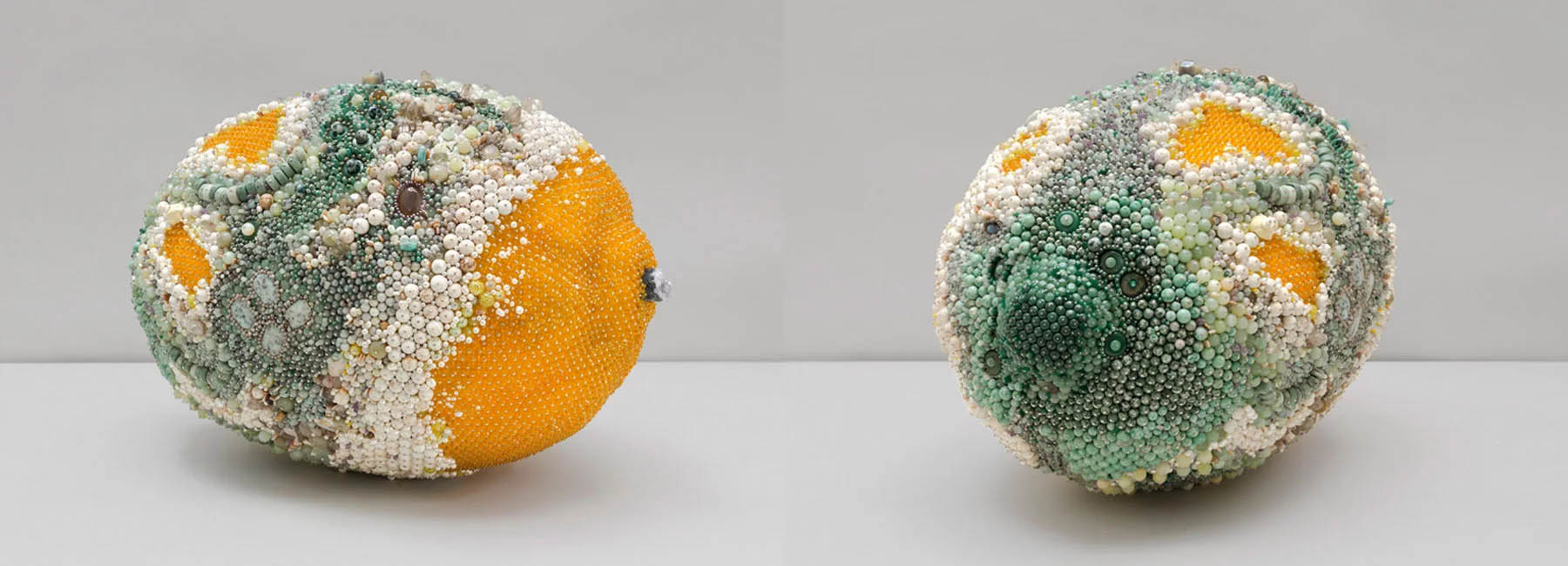 هنرمند براي تهيه ميوه از يک پايه بزرگ پلي استايرن براي اندازه گيري استفاده ميکند که عرض آن تا 28 اينچ است. در اين نقطه از شروع روي الگوها رنگ آميزي مي کند که نشان مي دهد کدام قسمت از ليمو يا هلو پوسيده مي شود. فوم سپس با پين هاي فلزي سوراخ مي شود که آرايه سنگهاي قيمتي را در خود نگه مي دارند.