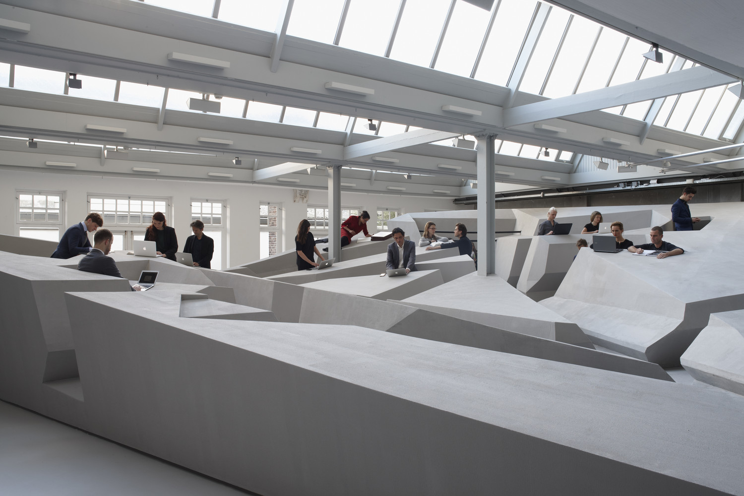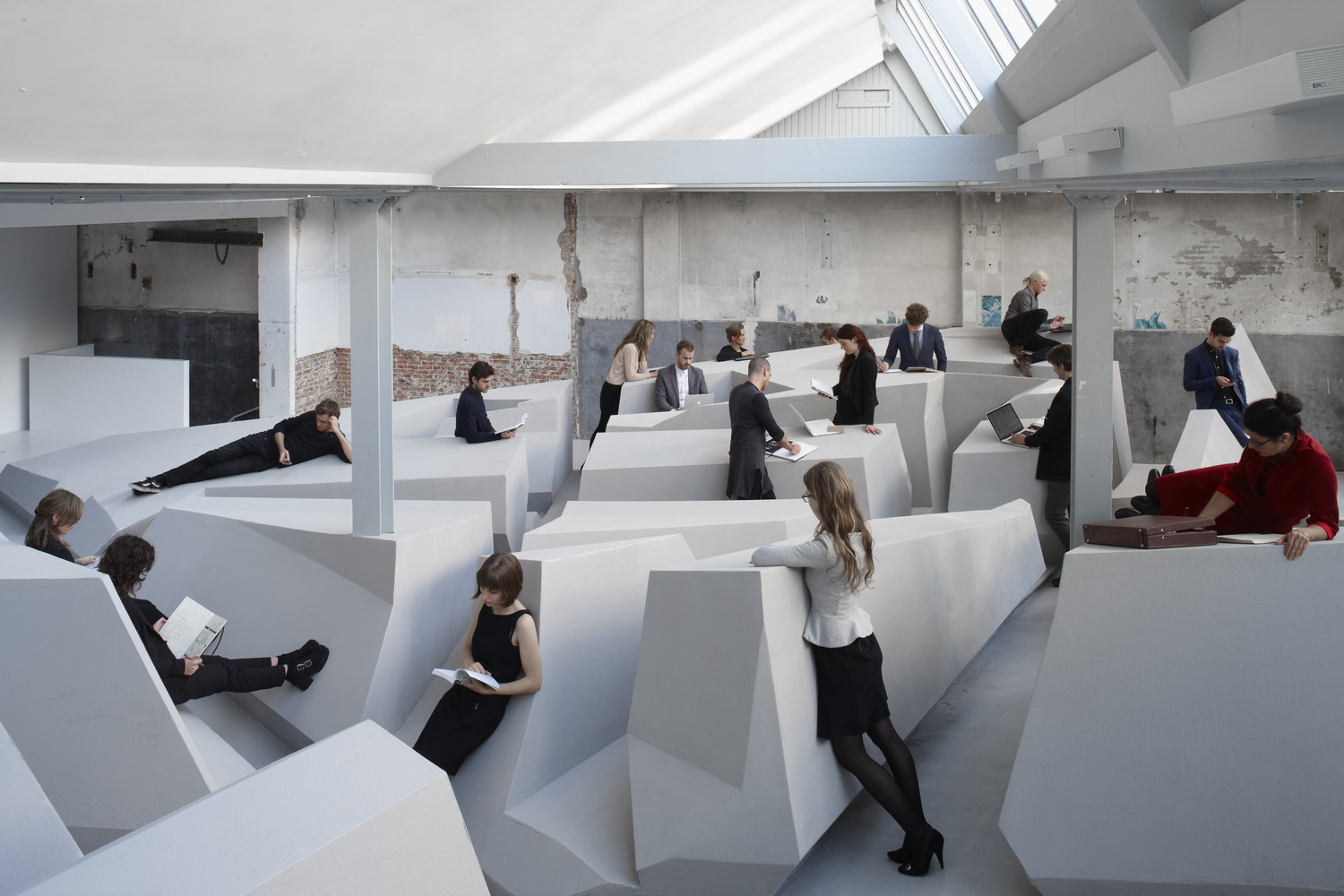 مجموعه اي از سطوح زاويه اي، فرورفتگي ها و بيرون زدگي ها کاربران را به تعامل دعوت مي کند بعضي از کاربران به طور طبيعي به فرم هاي به وجود آمده تکيه مي دهند يا به عنوان استراحت با رايانه يا نوت بوک خود کار مي کنند بعضي ديگر نيز به کارهاي تعاملي و گروهي مشغول مي شوند و حتي در حين خستگي مي توانند دراز کشيده و در حالت خوابيده به ادامه کار بپردازند.