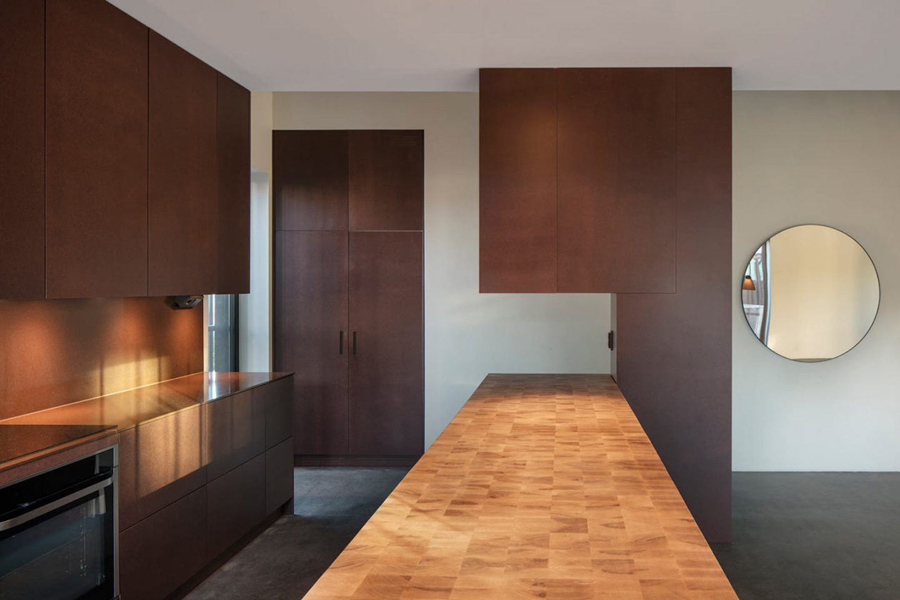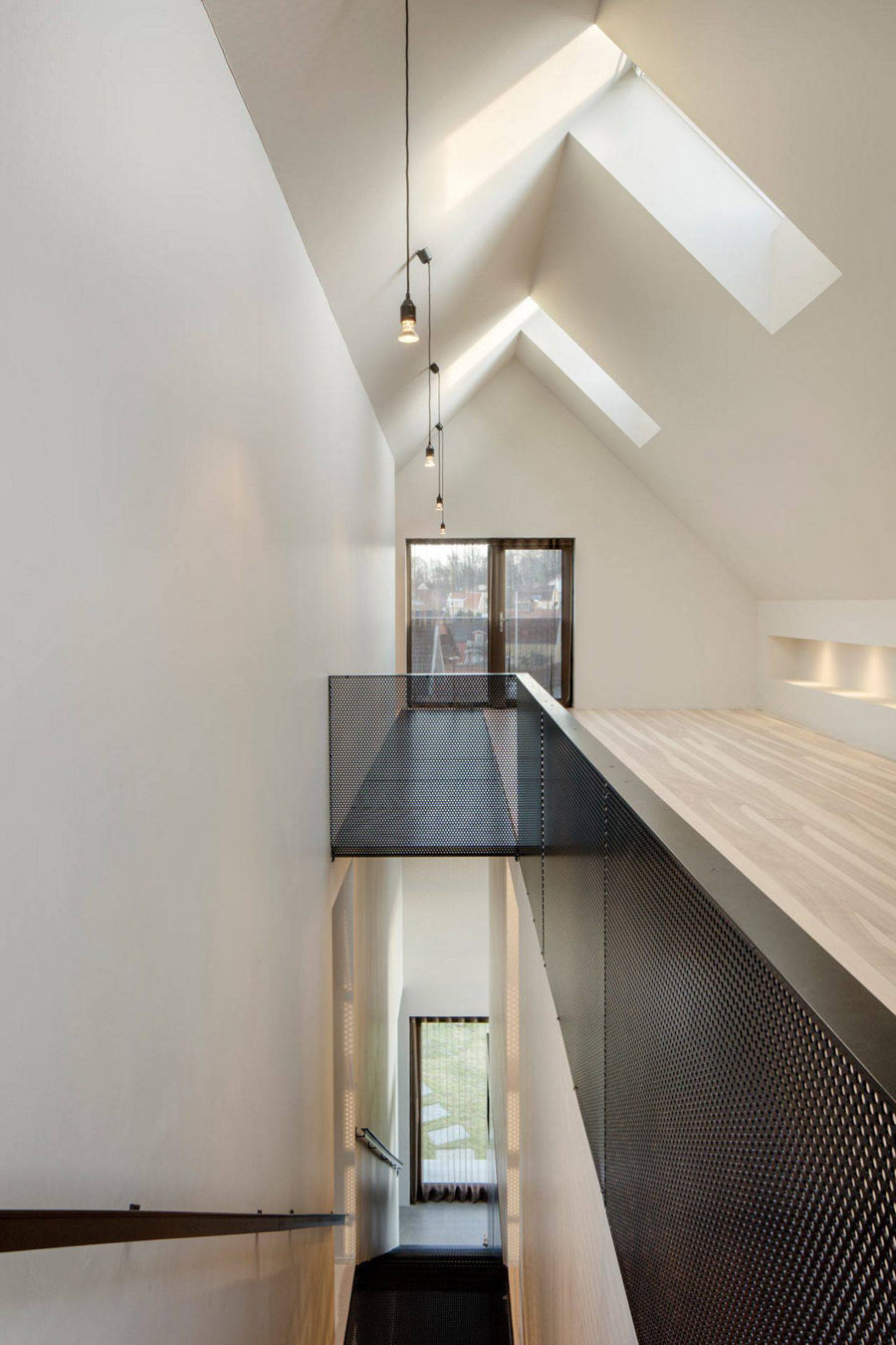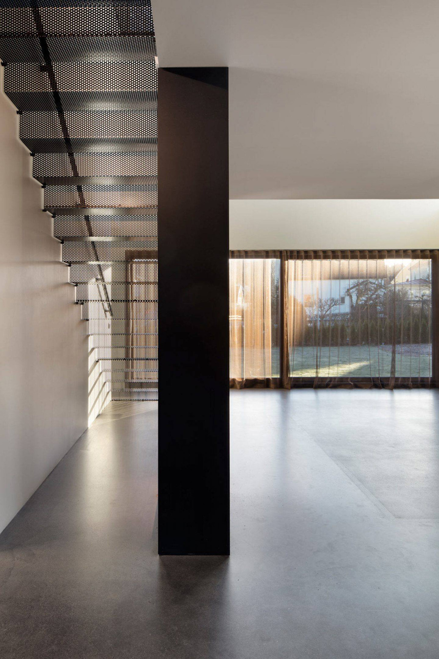 در داخل، يک راه پله فولادي سوراخ دار مناطق مختلف زندگي، از آشپزخانه و اتاق هاي ناهار خوري در طبقه همکف، اتاق خواب ها و حمام ها در طبقه دوم را جدا مي کند. راه پله يک عنصر اصلي در طراحي است، خانه را در دو نيمه مورب تقسيم مي کند.
