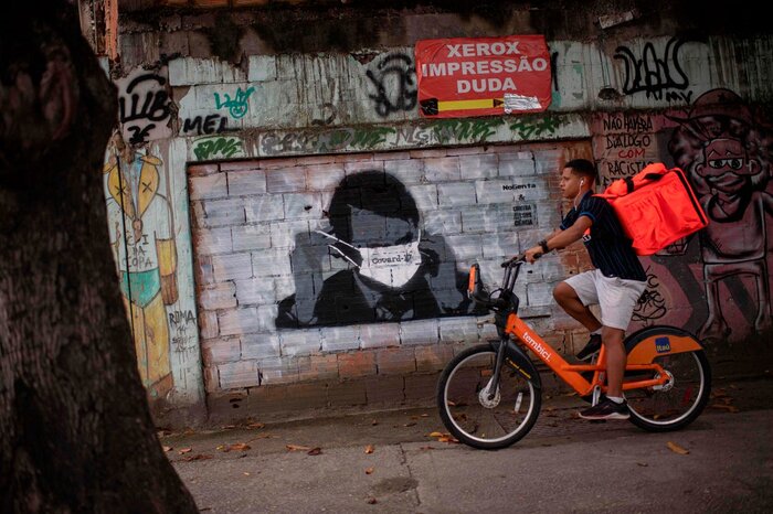 نقاشي ديواري از رئيس جمهور برزيل در شهر ريو دو ژانيرو بر ديوار نقش بسته که با ماسک صورت خود را پوشيده است.