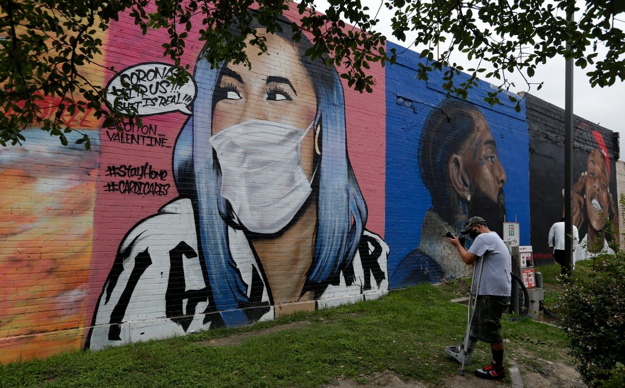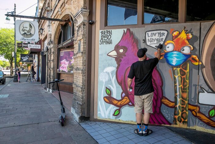 هنرمندان نقاشي ديواري از گالري HOPE Outdoor درحال کشيدن نقاشيهايي با پيام هاي محافظت در برابر ويروس کرونا در شهر تگزاس هستند.