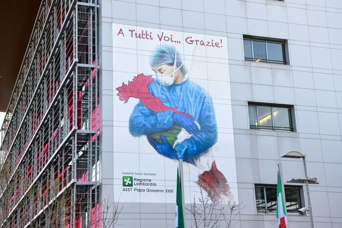 نقاشي ديواري در شهر برگامو در شمال ايتاليا که پرستاري نشان مي دهد که نقشه مزين به پرچم ايتاليا را همچون نوزادي در آغوش گرفته و مراقبت مي کند.