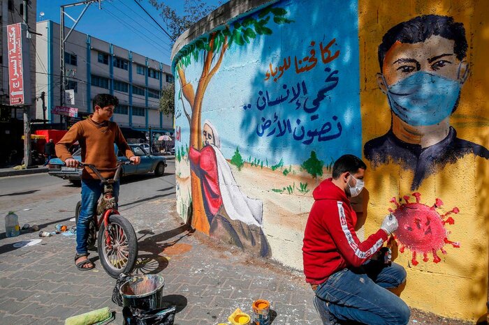 يک هنرمند فلسطيني درحال نوشتن جمله ما از انسانها در برابر اين بيماري واگيردار محافظت ميکنيم و زمين را حفظ ميکنيم.اين گرفيتي در نوار غزه است.