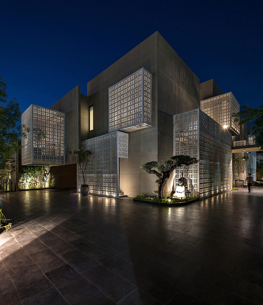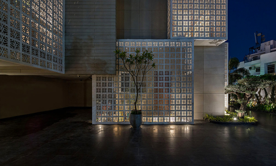 پنل هاي دکوراتيو تزئيني با الهام از گلدوزي سنتي CHIKAN نصب شدند تا نماي بيروني اين خانه مدرن را از لحاظ بصري به بخش هاي کوچکتري تقسيم کرده و از طرف ديگر سايه اي براي محافظت از آفتاب سوزان در فضاي داخلي ساختمان ايجاد کنند.