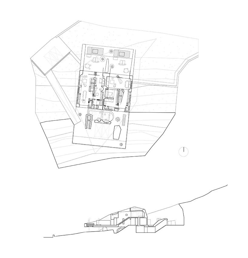 اين دو خانه تراشيده شده شامل يک اتاق نشيمن و ناهار خوري، آشپزخانه، سرويس بهداشتي و اتاق خواب مستر با کمد و حمام است. فضاي زير شيرواني متشکل از اتاق خواب و حمام، در مرتفع ترين بخش ساختمان قرار دارد. در زيرزمين، فضاهاي انباري، موتورخانه و مخزن جمع آوري آب باران قرار داده شده است. خانه ها از هر طرف توسط فضاي باز احاطه شده اند.