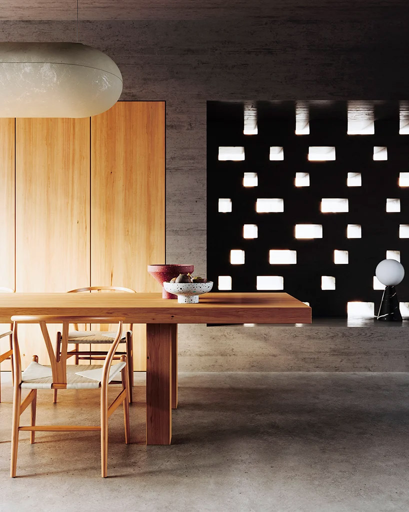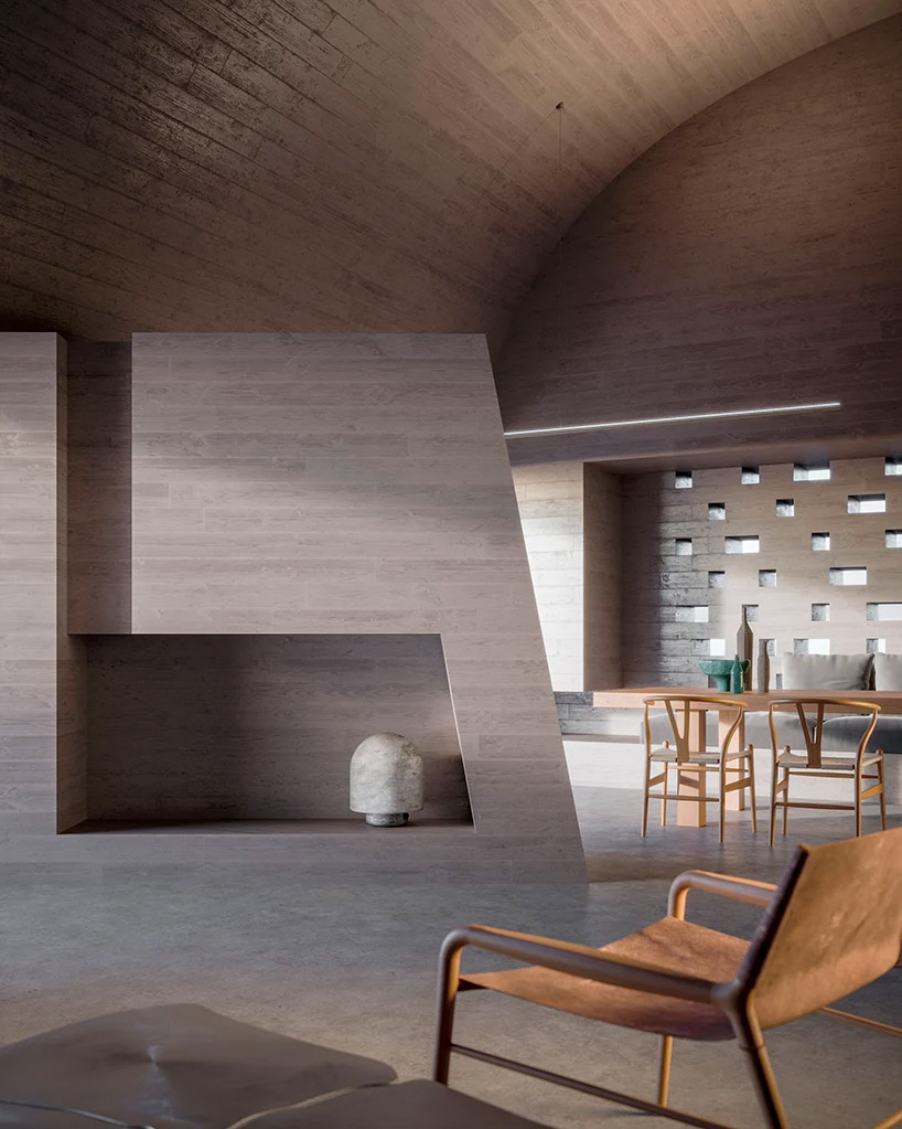 طراحي فضاي داخلي صخره مانند، احساس زندگي در غار را ايجاد مي کند. هر يک از فضاها شبيه خطوط يک چندضلعي مي باشند که به صورت زنجيره اي بهم پيوسته اند و الگويي از هندسه ي زمين را نمايش مي دهند، که همراه با ورودي ها و قلاب روي ديوار و سقف هاي فرسوده شده، باعث انتقال نور طبيعي مي شود.