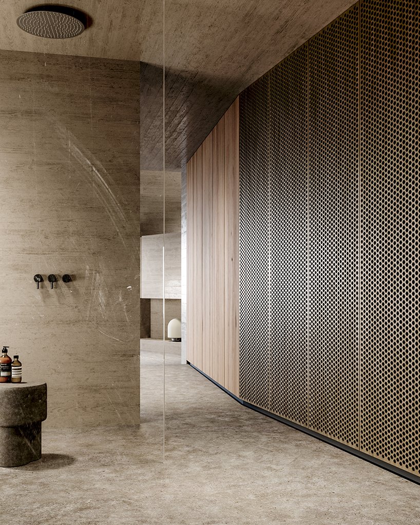 نماي خارجي با استفاده از بتن بدون اندود، سايه ي خاکي ايجاد مي کند که شباهت به لايه هاي آتشفشاني دارد، که در بخش هايي به صورت صاف، بدون مرمت و به صورت تکه تکه فرم داده شده است. در حالي که گچ سيماني (گچ گيپتون) بر روي بستر کف به کار مي رود، همان مواد و مصالح و بافت براي سطوح داخلي انتخاب مي گردد. چوب طبيعي بر روي قاب پنجره و مبلمان، ورق هاي فلزي اکسيد شده براي کمد لباس ها و سنگ هاي طبيعي متنوع براي ساير بخش هاي مبلمان در بافت هاي غبار آلود و مات و رنگ هاي خاکي، فضا و جو اقامتگاهي سنگي را کامل مي کنند.