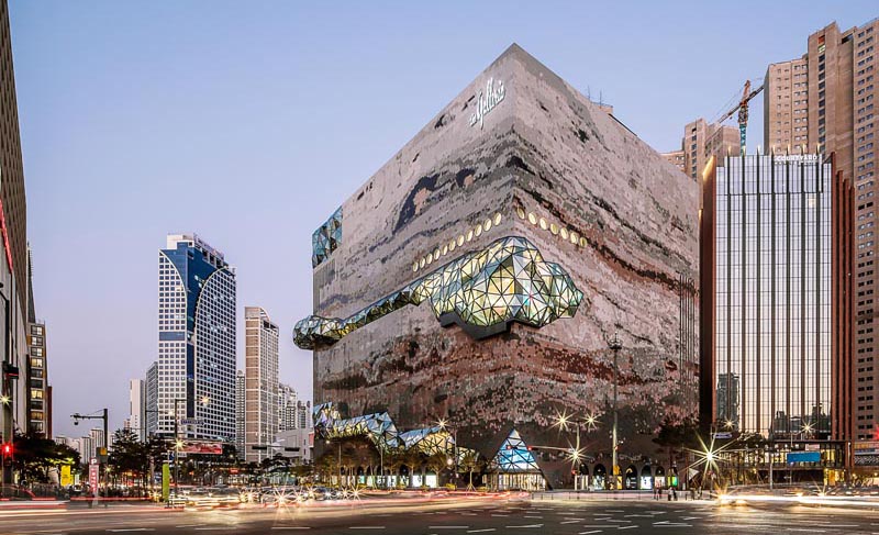 شرکت معماري OMA به تازگي Galleria ، يک فروشگاه بزرگ واقع در Gwanggyo ، کره جنوبي را تکميل کرده است که داراي نماي سنگي موزائيک بافتي و شيشه اي چند وجهي است.