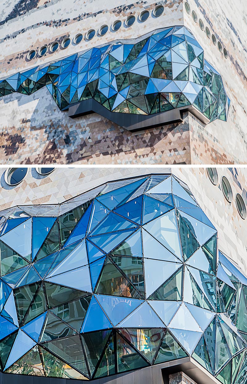 اين طرح ملهم از طبيعت ساخته شده است. شيشه چند لايه برجسته، فرم هايي از سنگ را نشان مي دهد. از طريق شيشه، فعاليت هاي خريد و فروش و فرهنگي در داخل براي رهگذران اين شهر آشکار مي شود.