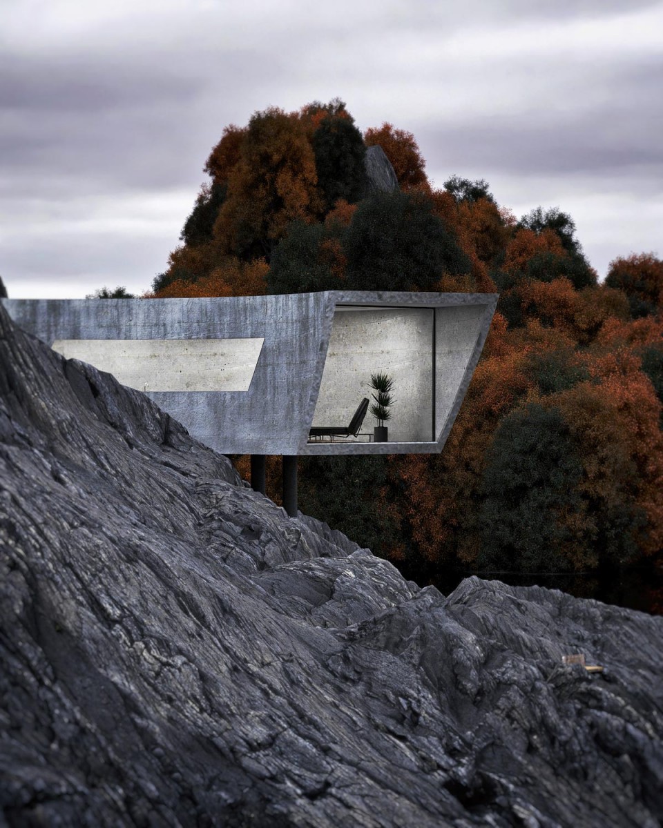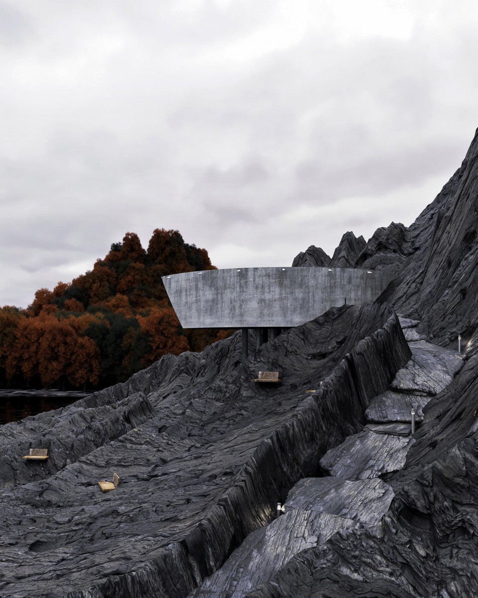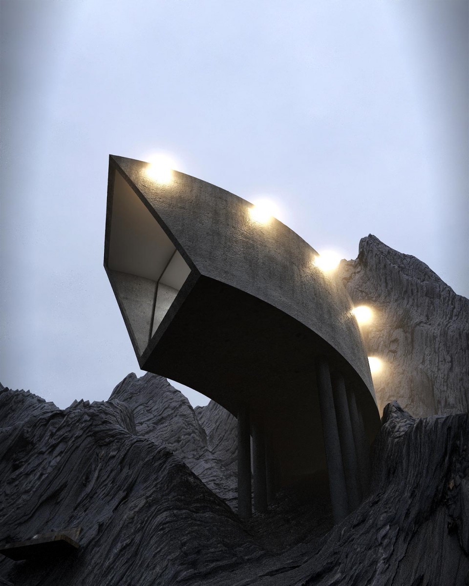 اين پناهگاه خميده بر روي فرو رفتگي سنگ هاي آتشفشاني قرار دارد، که بر روي چهار جفت قلاب سيماني ساخته شده است. به نظر مي رسد که شبيه يک مکان براي تعطيلات باشد، ساختمان داراي يک ورودي در انتها است، در حالي که داراي يک طرح بريده ي 45 درجه است، پنجره اي کامل از کف تا سقف، چشم اندازي رو به حوضچه ي زير دارد.