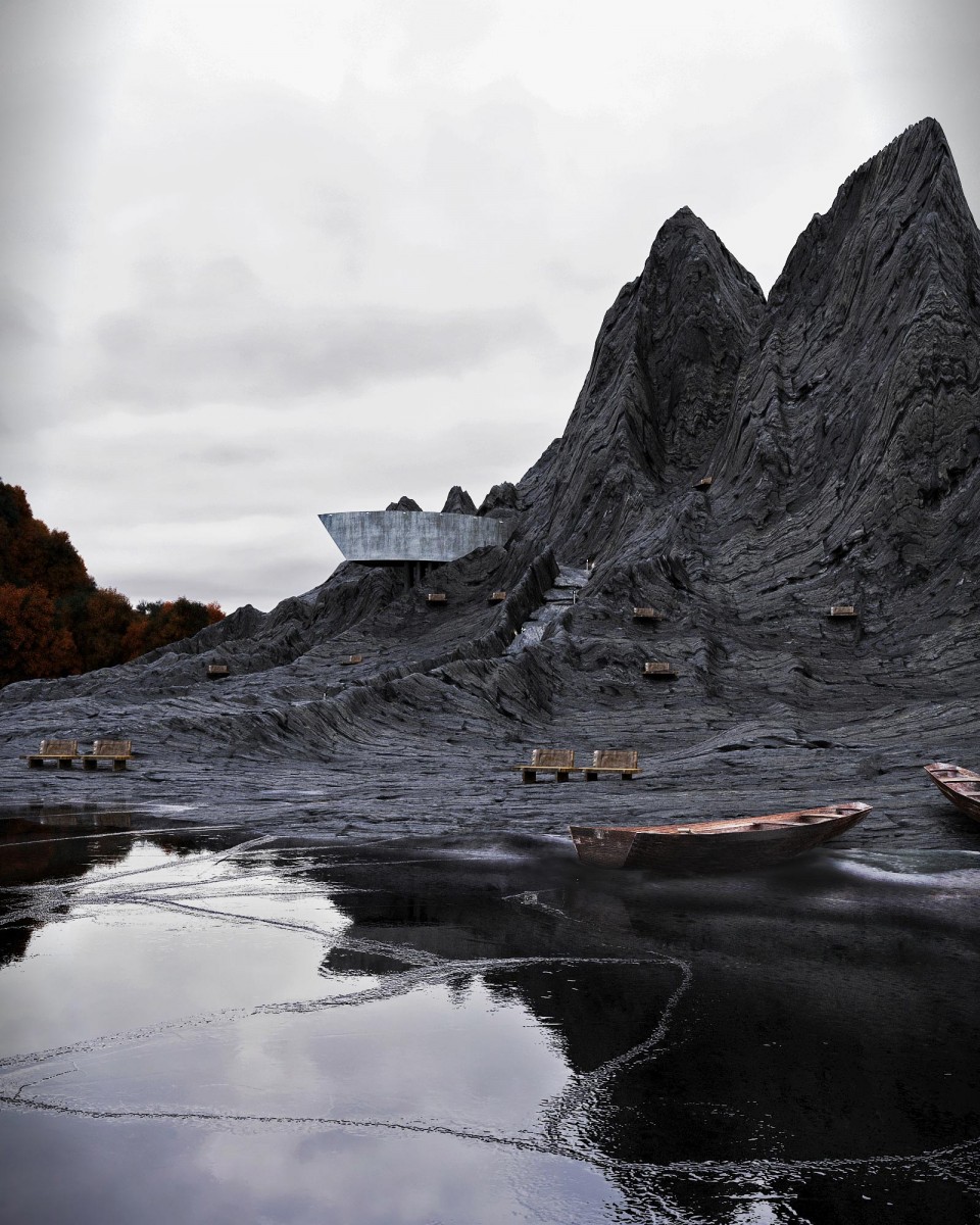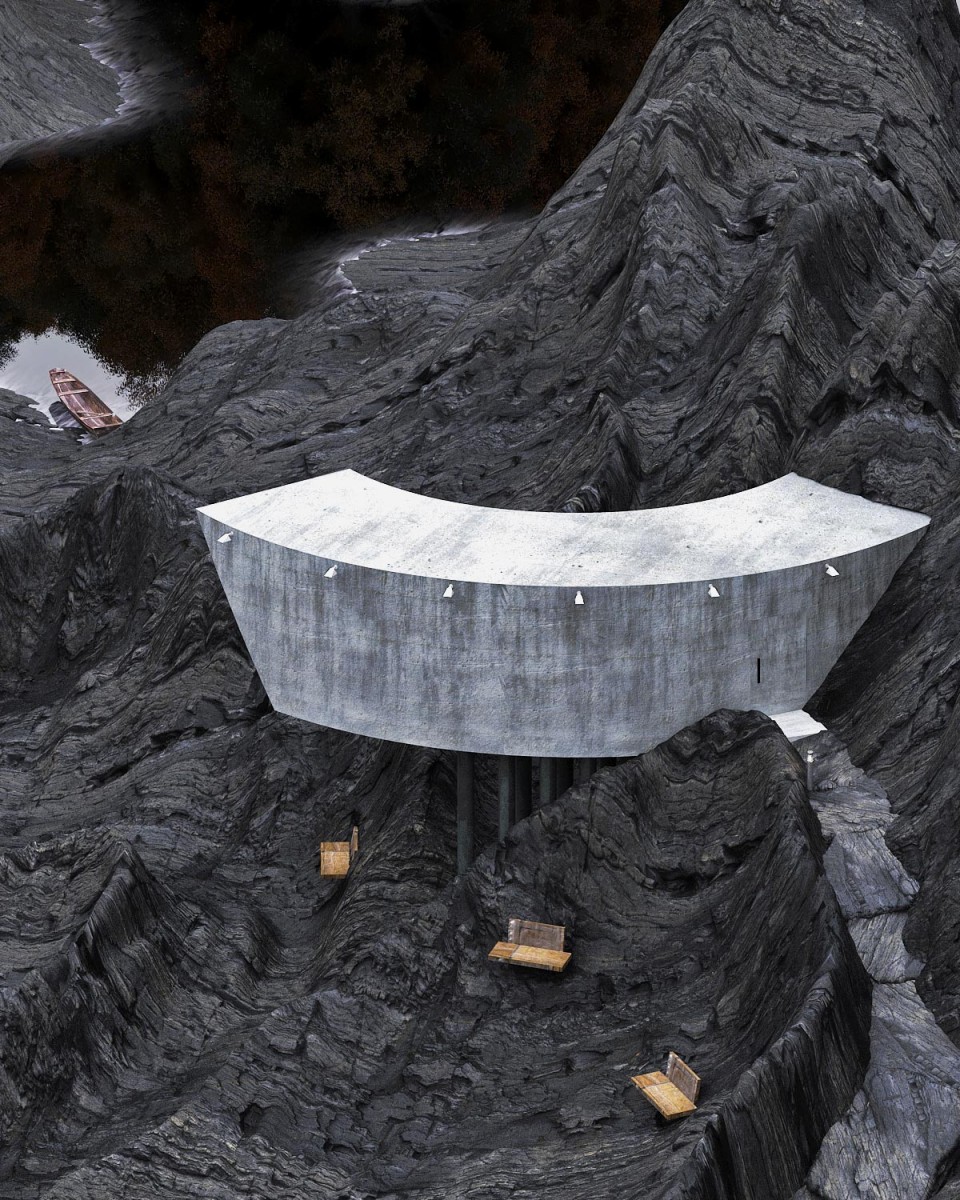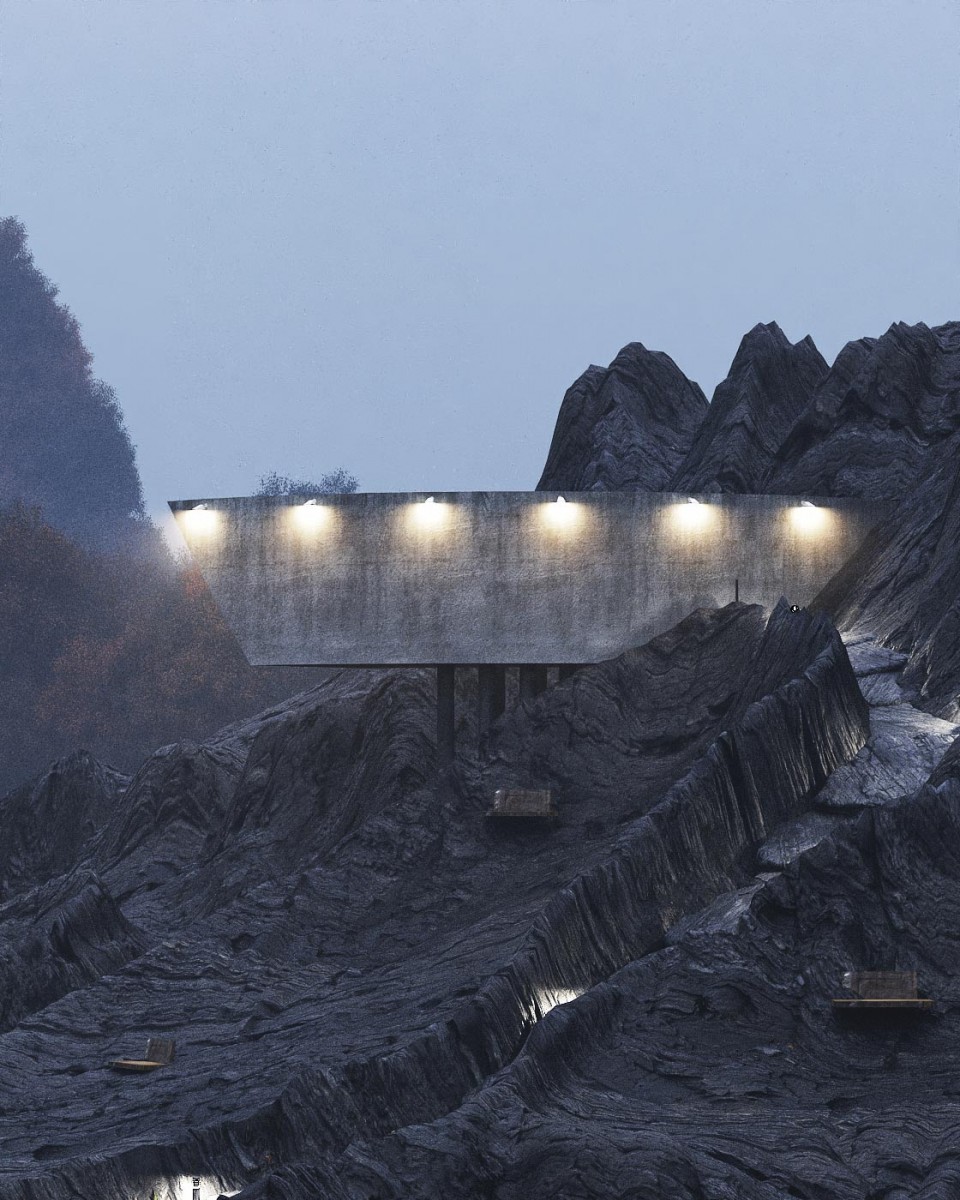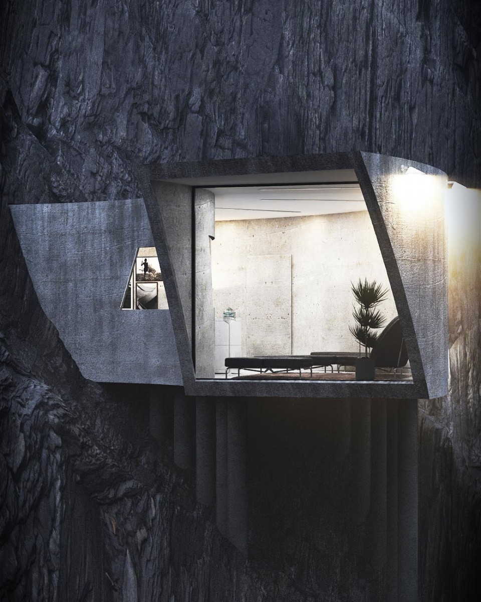 اين پناهگاه خميده بر روي فرو رفتگي سنگ هاي آتشفشاني قرار دارد، که بر روي چهار جفت قلاب سيماني ساخته شده است. به نظر مي رسد که شبيه يک مکان براي تعطيلات باشد، ساختمان داراي يک ورودي در انتها است، در حالي که داراي يک طرح بريده ي 45 درجه است، پنجره اي کامل از کف تا سقف، چشم اندازي رو به حوضچه ي زير دارد.