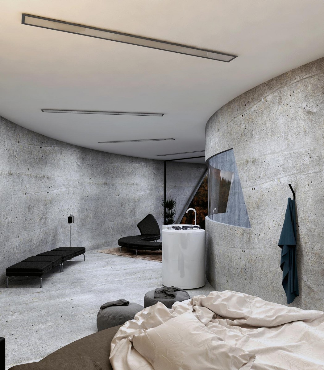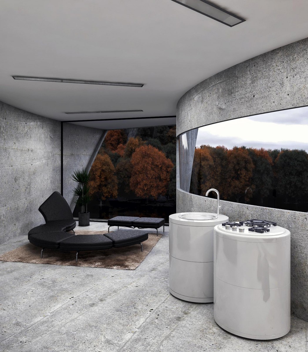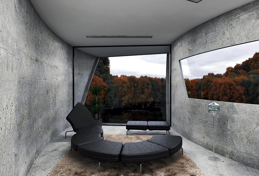 در فضاي داخلي منحني شکل، يک اتاق مينيماليستي وجود دارد که به 3 بخش تقسيم مي شود: