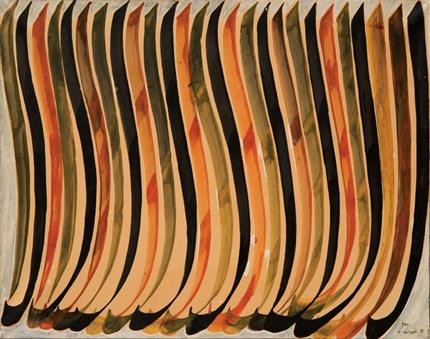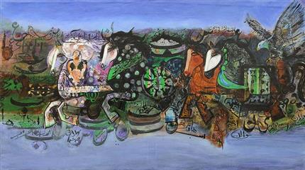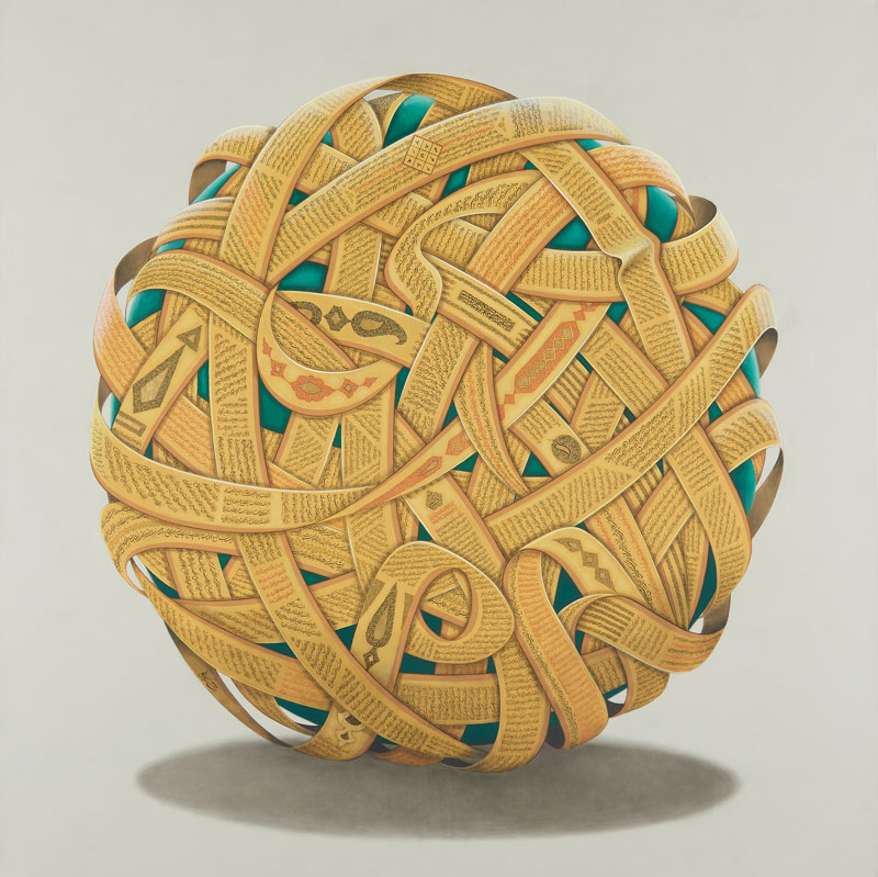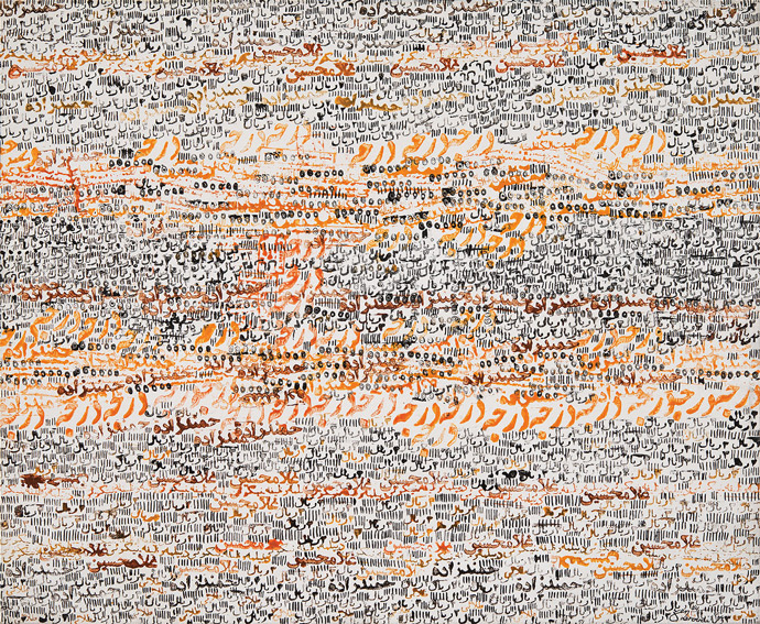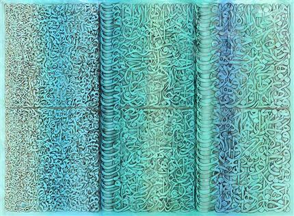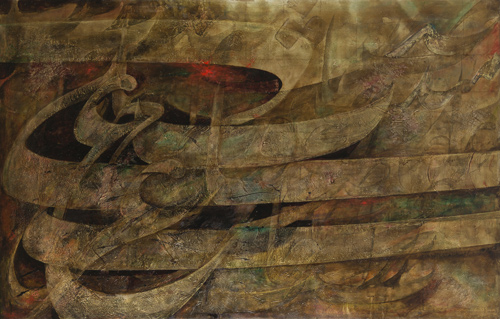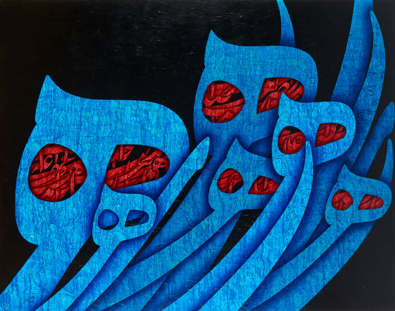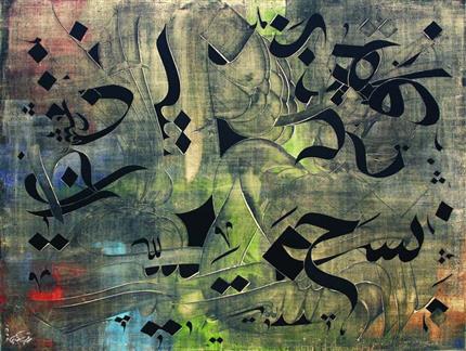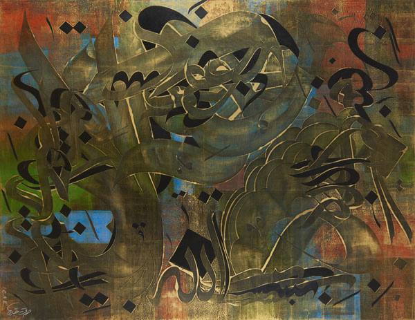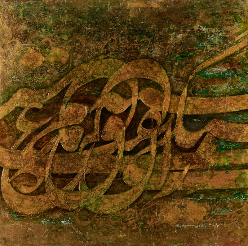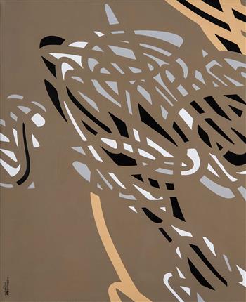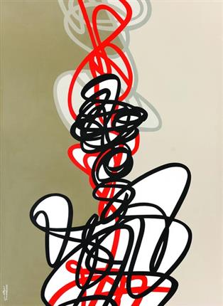 اثر حاضر يکي از آثار شاخص اوست که در آن، خوشنويسي ايراني بهانهاي براي نمايش يک فرم هندسي و حجمي بر بوم نقاشي شده است. در اين تابلو، خط با ديدگاهي متفاوت و فارغ از بار معنايي و گاه ناخوانا، دستمايهاي بصري و بازتابدهنده الگوهاي ذهني هنرمند در گستره بوم شده و به عبارتي خوشنويسي مقام ثانوي را در نقاشي يافته است.
