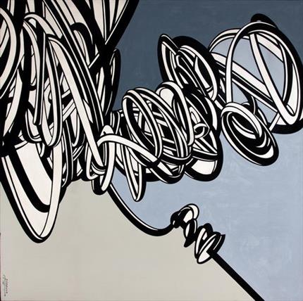 در آثار کوروش شيشهگران، خط به عنوان عنصري بصري به استقلالي بيمانند دست مييابد که بر پهنه بوم بسان نوارهايي پيچان ميچرخد و در چرخش خود فضايي آکنده از انرژي و سرزندگي را شکل ميدهد. خط نمادي از جريان هستي است که نيروي پرتلاطم خود را به گردش در ميآورد و «بود» را از «عدم» ميآفريند. رد پاي اين موجوديت يافتن در خطوط در هم تنيده نمادپردازي ميشود؛ چيزي که در نگاه نخست آشفته است به واسطه وجود نظمي مستتر، اين کلاف سردرگم را هويت ميبخشد و گاهي شکلي ارگانيک را تداعي ميکند. بدين معنا روند شکلگيري اثر، تقابل گره و گرهگشاي است که در تعاملي فراکتالي خطوط بيقرار را نظم ميدهد و بيکرانگي عدم را در کرانمندي هستي محدود ميکند.