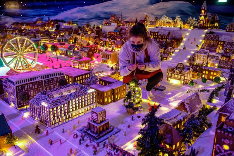 يک شهر مينياتوري پر از خانههاي کوچک، قطار، اتومبيل و کشتي که همه از نان زنجبيلي ساخته شده است در شهر برگن، نروژ بمناسبت ايام کريسمس.