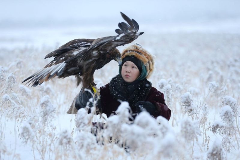 عقاب طلايي رام شده در يک مسابقه شکار سنتي در منطقه آلماتي قزاقستان شرکت ميکند.