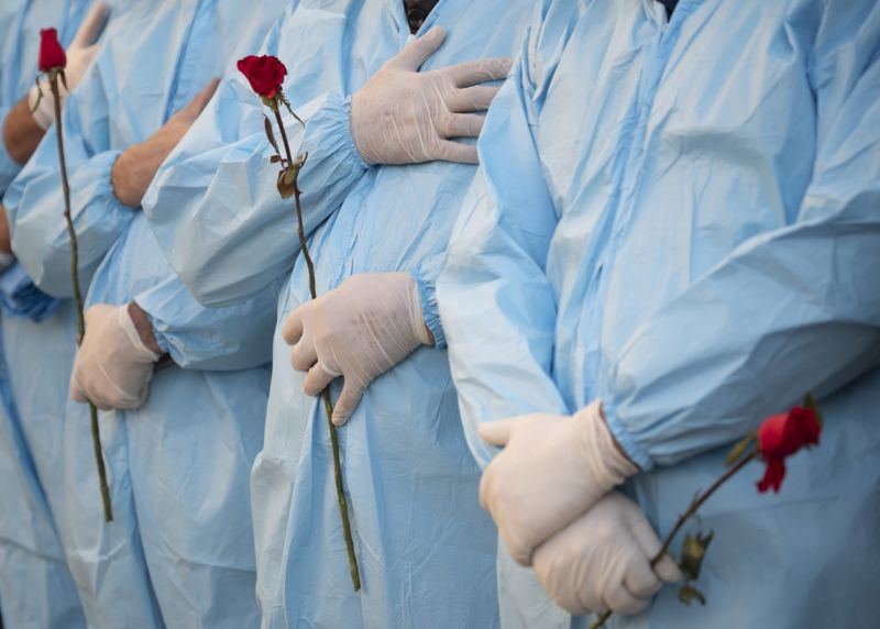 مراسم تشييع پرسنل بيمارستان رسول اکرم تهران براي همکار ۲۵ ساله خود که در اثر ابتلا به کرونا درگذشت.