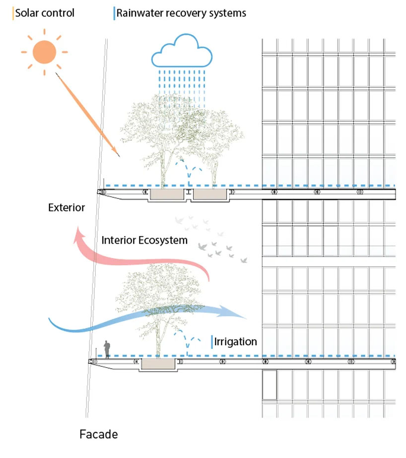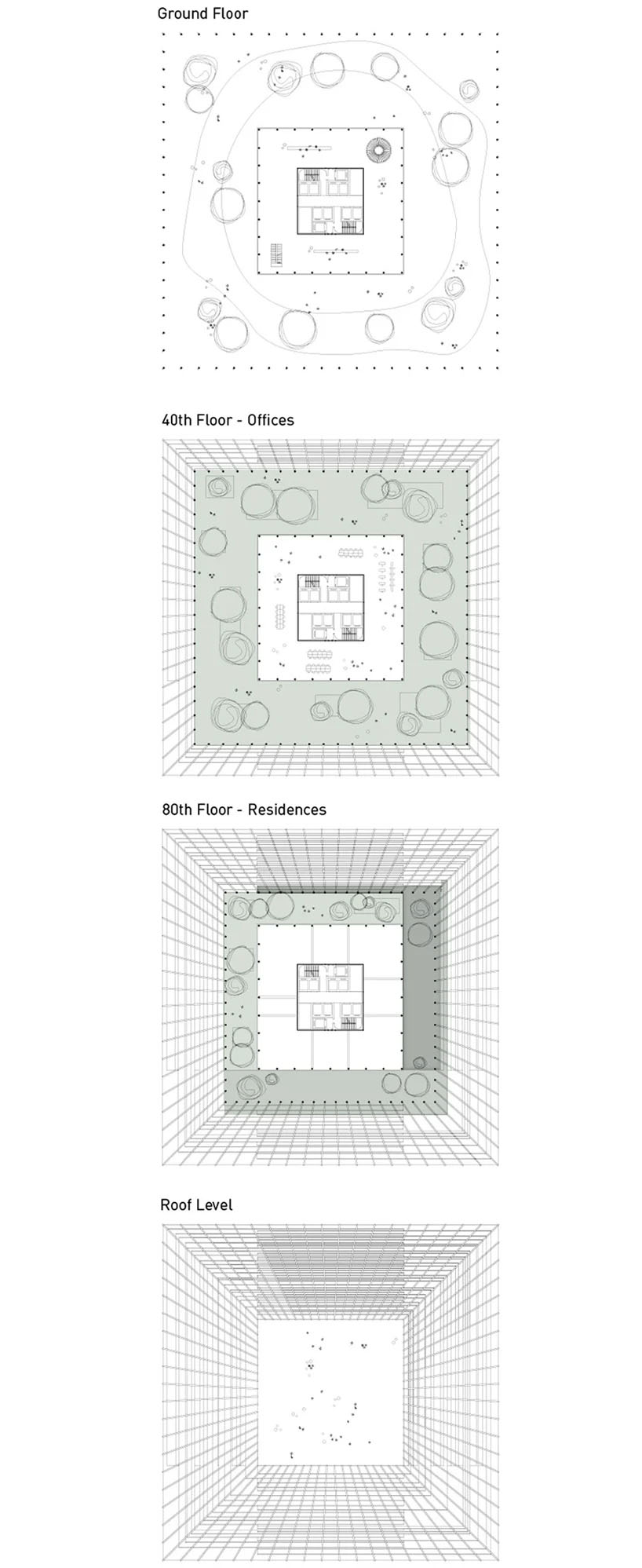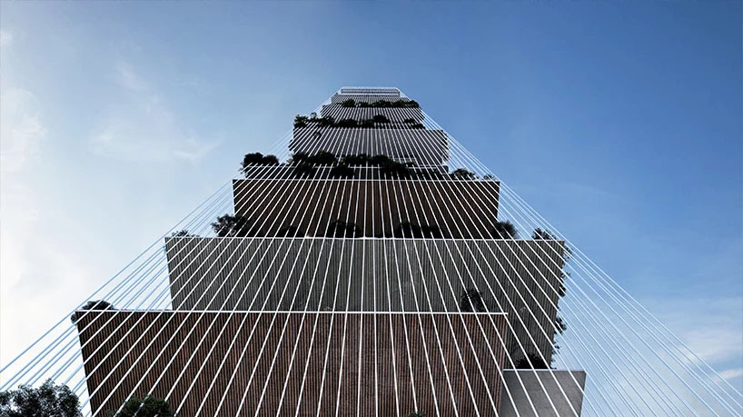 در اين طرح يک هسته اصلي توابع اصلي را کاملاً احاطه کرده است که توسط باغهاي بزرگ آويز مانند پشتيباني مي شوند و توسط پرده خارجي کابل هاي فولادي نگه داشته مي شوند، که هم به عنوان ساختار و هم به عنوان نماي ساختمان عمل مي کنند.