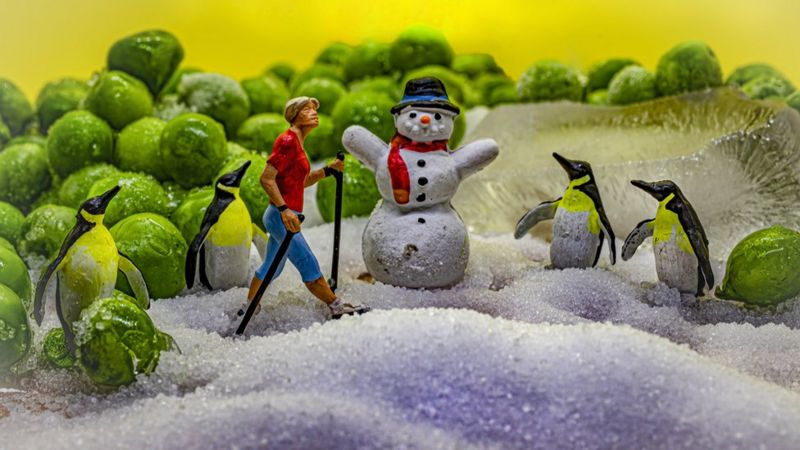 او ميگويد: "اولين صحنه مينياتوري من چند ورزشکار بودند که از نخود فرنگيهاي منجمد بالا ميرفتند. براي گرفتن عکسهاي اول خيلي به دردسر افتادم. من و شريک زندگيام پل، چند روز نخود فرنگيهايي که يخشان باز شده بود را ميخورديم. ولي سرانجام موفق شدم."