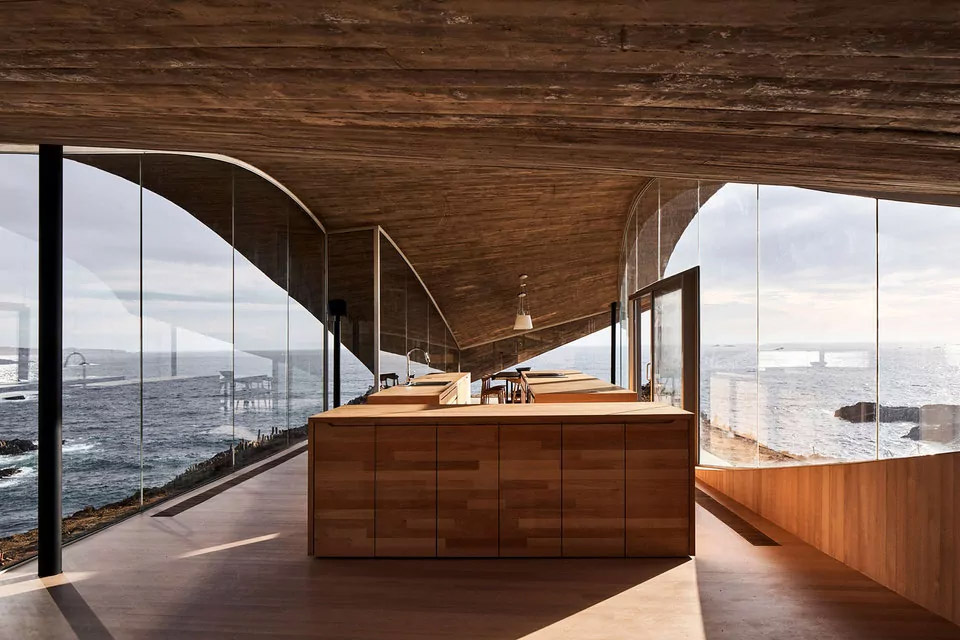 به گزارش گالري آنلاين، سقف اين استراحتگاه پس از زمين هاي صخره اي که در آن واقع شده با پوششي از بتن موجدار که به سمت رودخانه پيش ميرود مسقف شده است. خميدگي هاي roofline نه تنها سيلوئت ارگانيک ايجاد مي کند بلکه کانتورهاي آن نيز سه قسمت مختلف فضاي داخلي ساختمان يعني سونا در قسمت جلويي که بعد از اتاق خواب و فضاي دور همي قرار مي گيرد و سپس آشپزخانه و سالن غذا خوري را در پشت ساختمان مشخص مي کنند. پيشروي سقف در پشت ساختمان نيز يک تراس مسقف در فضاي باز ايجاد کرده و سقف وسيع ساختمان توسط ستون هاي فولادي و ديوارهايي از پنجره هاي شيشه اي تمام قد پشتيباني مي شود و اتاق ها را در منظره تماشايي ساحلي غوطه ور مي کند.