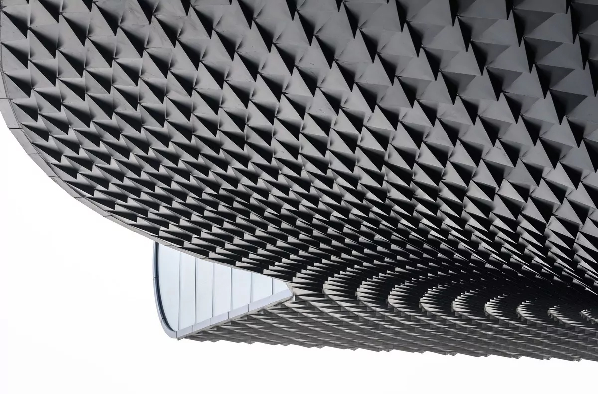 فناوري BIM (مدلسازي اطلاعات ساختمان) بر روي صفحه آلومينيومي فلس مانند بکار گرفته شده که نصب بيش از 13 هزار قطعه در نماي ساختمان را ممکن ساخته و بافت مارپيچي موزوني را ايجاد کرده است. نماي واقعي-مجازي توازن کاملي در عايق سازي حرارتي و استفاده مناسب از نور طبيعي روز ايجاد کرده است. کليه دستگاه هاي الکترومکانيکي در زير زمين نصب شده و سقف و نماي ساختمان طرحي يکپارچه ايجاد کرده است. اين طرح به واسطه اين فناوري تحقق پيدا کرده است.