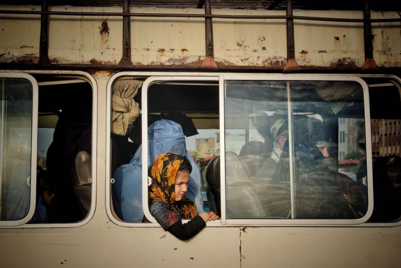 دختري سوار بر مينيبوس به همراه خانوادهاش. منطقهاي اطراف هرات، ژوئن ۲۰۲۰. عکس از مرتضي صمدي