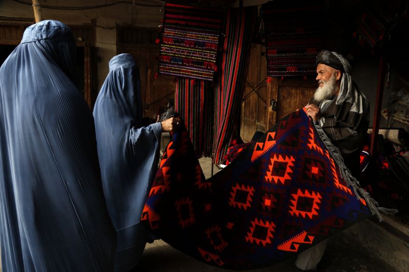 دو زن دستبافتهاي خود را به مغازهداري در فارياب ميفروشند. آوريل ۲۰۱۹. عکس از همايون بيگ