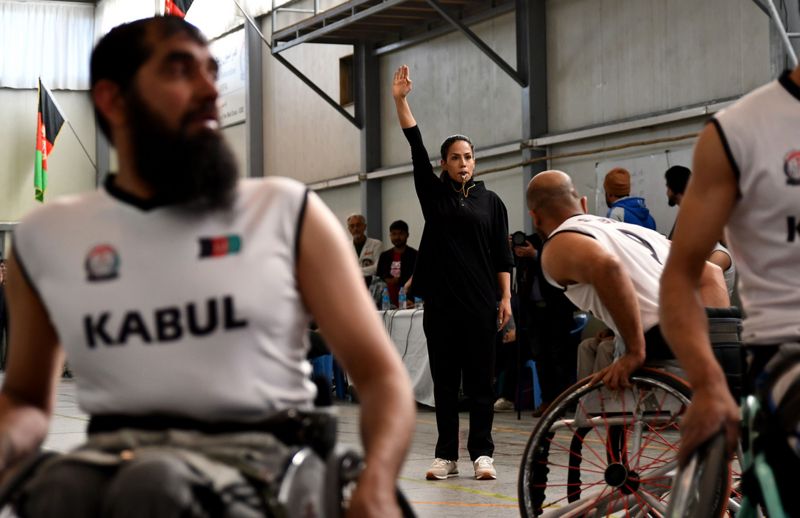 يک داور زن مسابقه بسکتبال روي ويلچر تيمهايي از بلخ و کابل را داوري ميکند. مارس ۲۰۱۹. عکس از محمدانور دانشيار