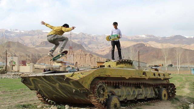 دو پسربچه روي لاشه يک تانک نظامي تمرين اسکيتبورد ميکنند. باميان، فوريه ۲۰۲۱. عکسي از يک عکاس زن افغان که پس از سقوط کابل بدست طالبان به خاطر مسايل امنيتي خواستار حذف نامش از نمايشگاه شد