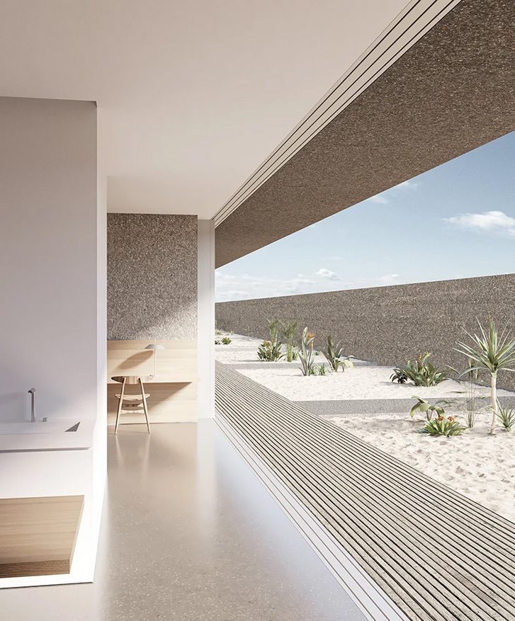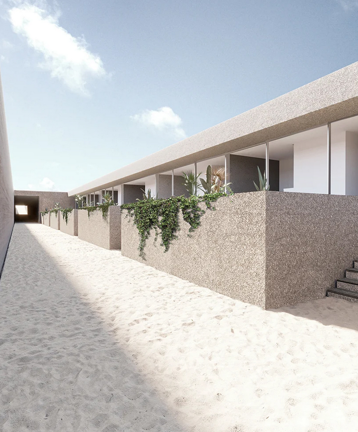 اگر چه اين سه بخش که توسط david cirocchi و plinio vanni طراحي شده است، جدا از يکديگر بنظر مي آيند اما در واقع توسط يک عنصر طبيعي يعني ماسه به هم پيوسته اند. ساختمان ها در دل دريا جاي مي گيرند. مسافران از طريق مسير شيب دار ماسه اي تا بستر دريا پيش مي روند و به محوطه اي مي رسند که روشنايي اتاق ها از آنجا تامين مي شود. اتاق هاي مسکوني به دنبال هم قرار مي گيرند و به فضاي سرپوشيده اي منتهي مي شوند که فضاهاي عمومي را در خود جاي داده است. اين مسير تا سطح آب و تا بالاي يک سکوي ماسه اي ادامه پيدا مي کند که مي توان از آنجا بر روي آب کايت سواري کرد.