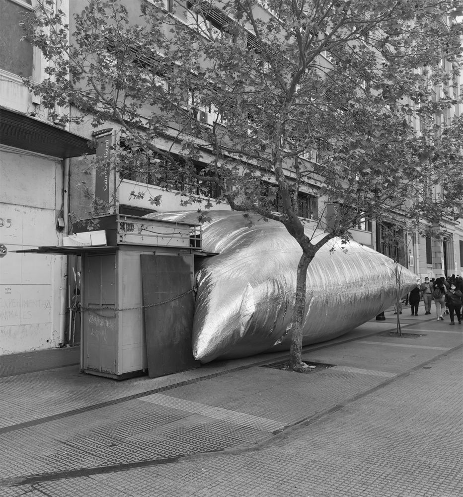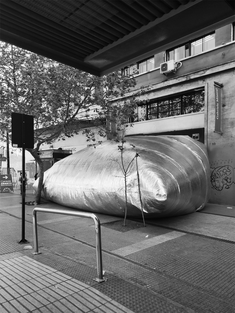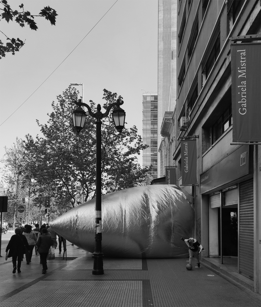 يک بالشت عظيم، نقره اي، نرم و باد شده از داخل گالري Gabriela Mistral تا پياده روي مقابل گالري گسترده شد.