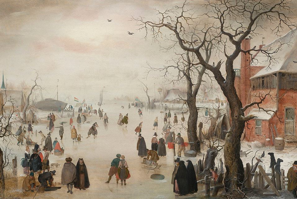منظره زمستاني در نزديکي يک روستا، حدود 1610–15. هندريک اورکمپ (هلندي، 1585-1634) تابلو رنگ روغن. هديه موعود رز ماري و اييک ون اوترلو، در حمايت از مرکز هنر هلند. با احترام، موزه هنرهاي زيبا، بوستون.