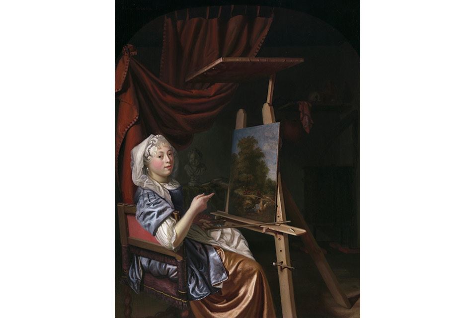سلف پرتره هنرمند در استوديوي او، حدود سال 1680. ماريا شالکن (هلندي، 1645/50–قبل از 1700) تابلو رنگ روغن. هديه رز ماري و اييک ون اوترلو، در حمايت از مرکز هنر هلند. عکس © موزه هنرهاي زيبا، بوستون.