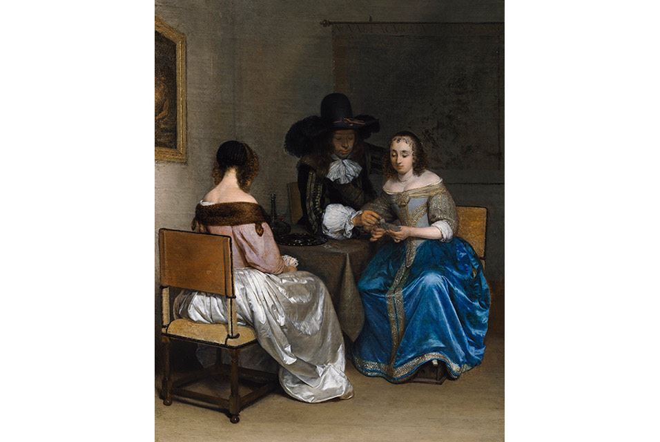 کارت بازان، حدود 1659. جرارد تر بورچ (هلندي، 1617–1681) تابلو رنگ روغن. هديه موعود رز ماري و اييک ون اوترلو، در حمايت از مرکز هنر هلند. با احترام، موزه هنرهاي زيبا، بوستون.