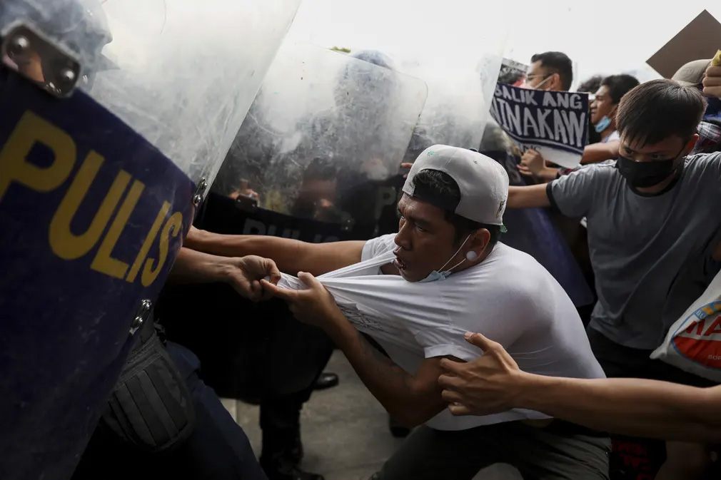 پليس فعالان معترض به بيانيه يFerdinand ‘Bongbong’ Marcos Jr و همکارشSara Duterte، دختر رئيس جمهور فعلي، در جريان تجمعي در کميسيون حقوق بشر در شهر Quezon را متفرق مي کند.