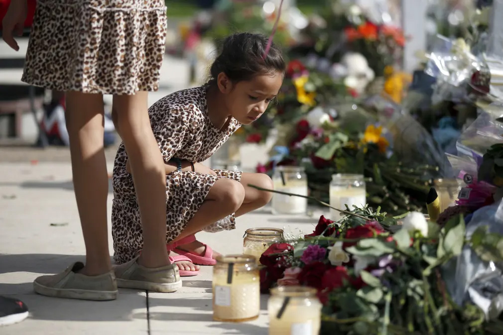 کودکي به يادبود قربانيان تيراندازي در مدرسه ابتدايي Robb در Uvalde نگاه مي کند. رئيس بخش امنيت عمومي تگزاس اذعان کرد 'تصميم اشتباهي بود' که پليس مسلح براي مدت طولاني در خارج از کلاسي منتظر بماند که فرد مسلح در تيراندازي مدرسه کودکان و معلمان را کشت.