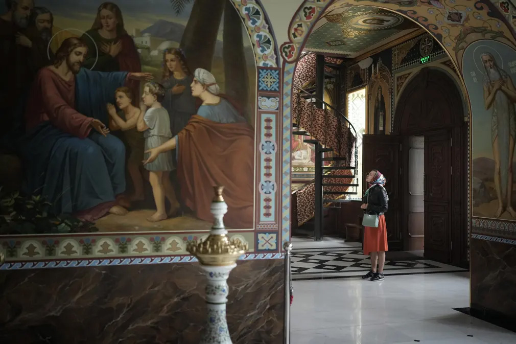 زني براي فکر کردن در صومعهPechersk Lavra مکث مي کند. در پي عقب نشيني روسيه از پايتخت اوکراين، نشانه هايي از زندگي عادي با استفاده کردن ساکنان از ساعات کوتاه شده منع رفت و آمد، بازگشايي کسب و کارها و وعده کشورهاي خارجي به بازگشت ديپلمات هاي خود را به کييف/Kyiv بازگشته است.