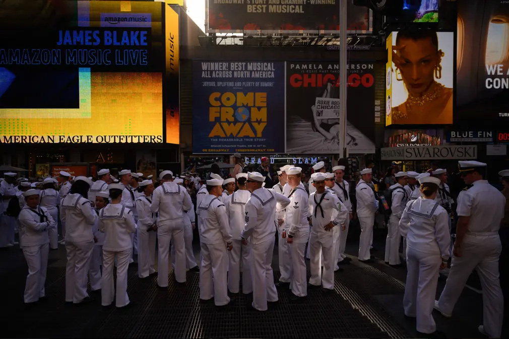 کارگران دريايي براي يک عکس گروهي در ميدان Times به عنوان بخشي از جشن هاي هفته ناوگان (Fleet Week) در نيويورک گرد هم مي آيند. هفته ناوگان يک جشن يه مدت يک هفته از خدمات دريايي است که با هدف فراهم کردن فرصتي براي عموم براي ديدار با ملوانان، تفنگداران دريايي و پرسنل گارد ساحلي از طريق رويدادهاي مختلف است.