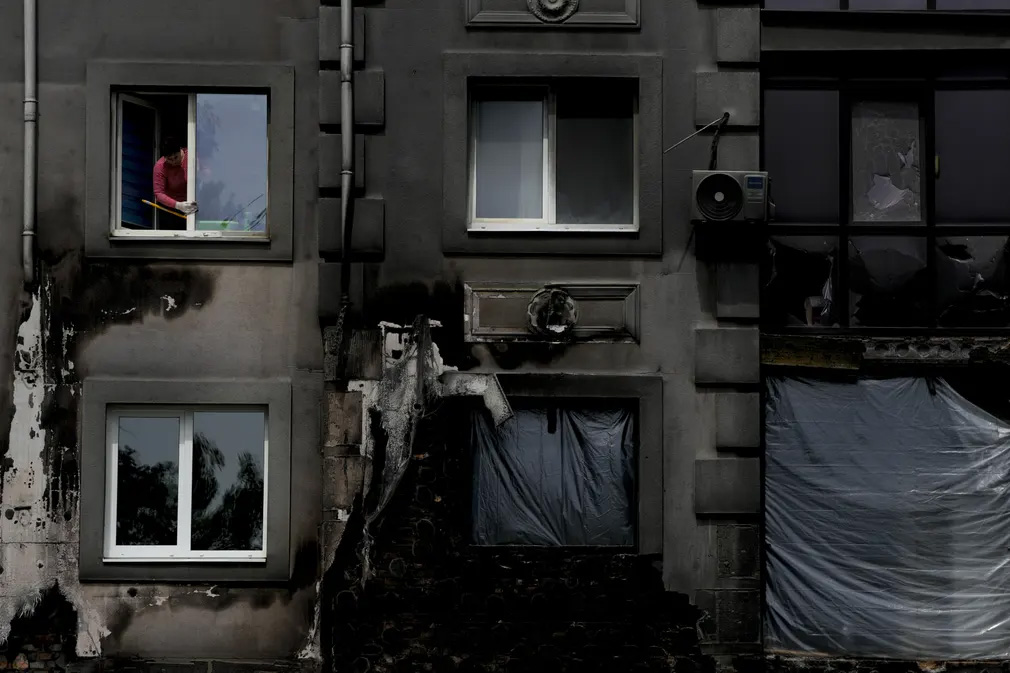 زني پنجره هاي خانه اش را که با گلوله باران در شهر در حومه Kyiv آسيب ديده است را تميز مي کند.