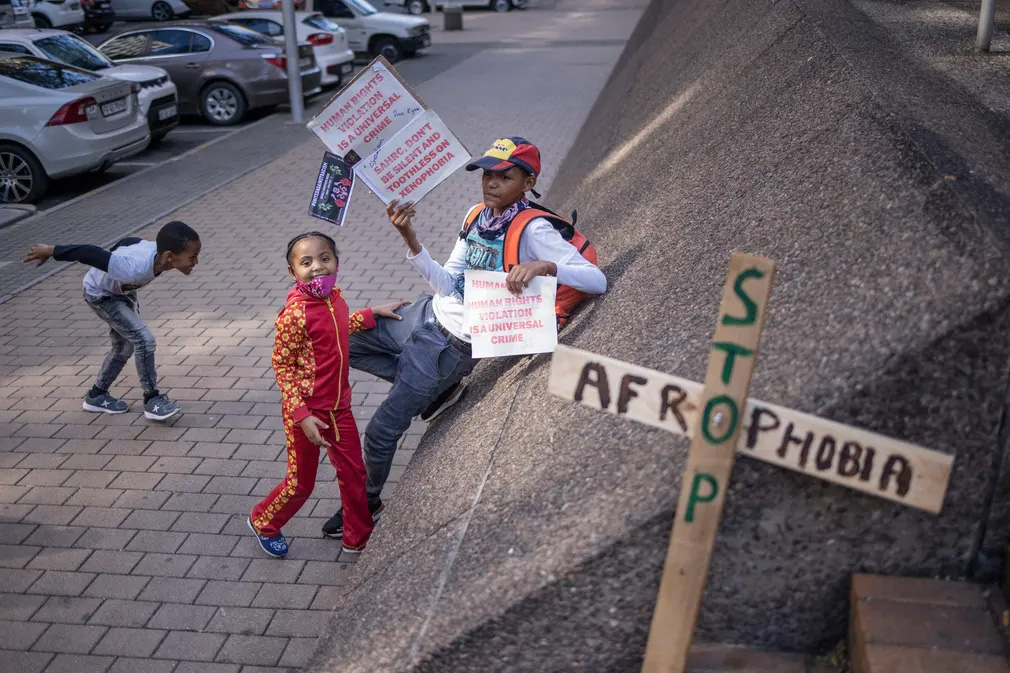 دانشجويان دبيرستاني و فعالان حقوق بشر در "روز آفريقا" در اعتراض به موج اخير بيگانه ستيزي و هوشياري در اين کشور به ظهور جنبش عمليات ضد مهاجر Dudula در مقابل کميسيون حقوق بشر افريقا اعتراض مي کنند.
