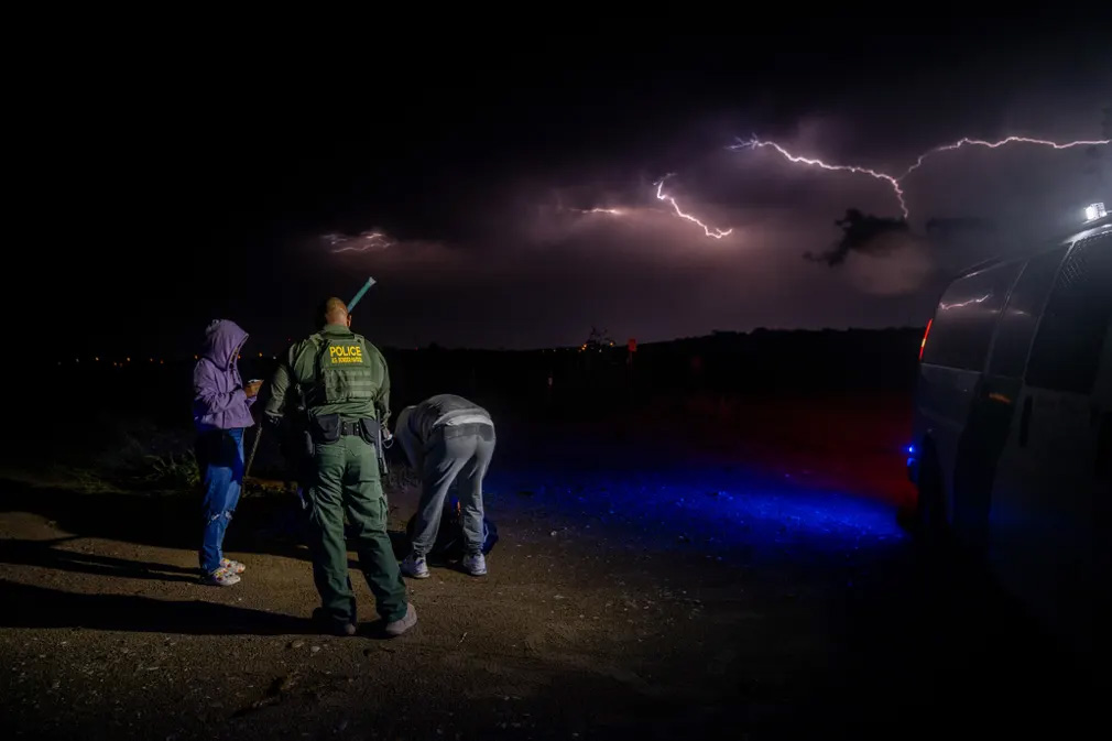 يک افسر گشت مرزي، مهاجران کلمبيا را پس از عبور از Rio Grande پردازش مي کند.