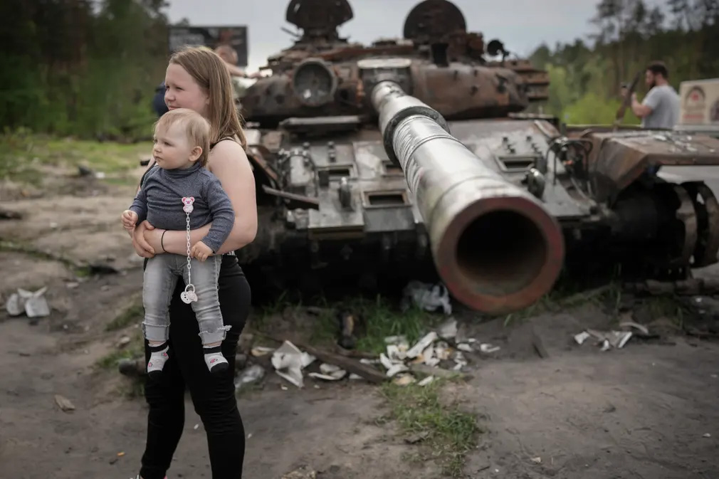 مردمي که دوباره به Kyiv برميگردند، توقف مي کنند تا از يک تانک نابود شده روسي در بزرگراه اصلي به داخل شهر عکس برداري کنند. در حالي که روسيه حمله خود را به شرق و جنوب اين کشور متمرکز مي کند، ساکنان منطقه Kyiv براي ارزيابي تلفات جنگ بر جوامع خود در حال بازگشت هستند.