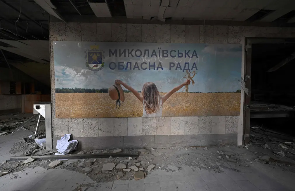بقاياي سالن ساختمان شوراي منطقه اي Mykolaiv پس از آن که در ماه مارس مورد اصابت يک موشک روسي قرار گرفت.